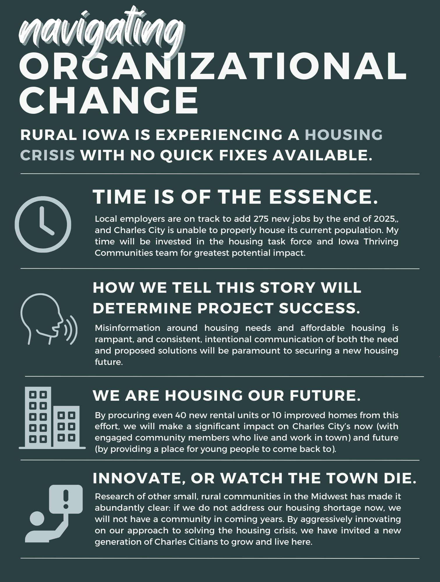 The response to our first round of LIHTC developers has been disheartening and disappointing. Moving forward, I plan to converse with our state team at IFA on better-equipping communities working to solve this problem. Although we have reached out and conversed extensively over the finer points of the program and developer selection, we have not been given resources to effectively combat the response. In the future, I will recommend that IFA officials do a more thorough job of walking communities through factual responses to inaccurate claims about affordable housing, share more details of the developer recruitment process, and create more transparency with articles and resources online. At the moment, ITC has a nearly non-existent internet presence, which also provides a challenge. As we (our Charles City ITC team) worked to provide legitimacy for a new program, it was frustrating not having consolidated resources to refer to.